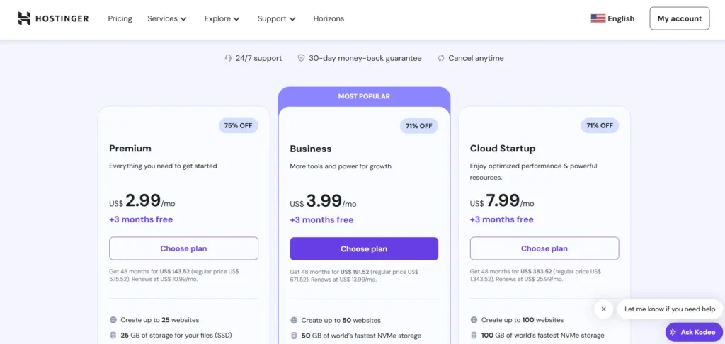 - Pricing: Hostinger is known for its affordability, offering plans that cater to a wide range of budgets, from personal websites to full-fledged eCommerce stores.