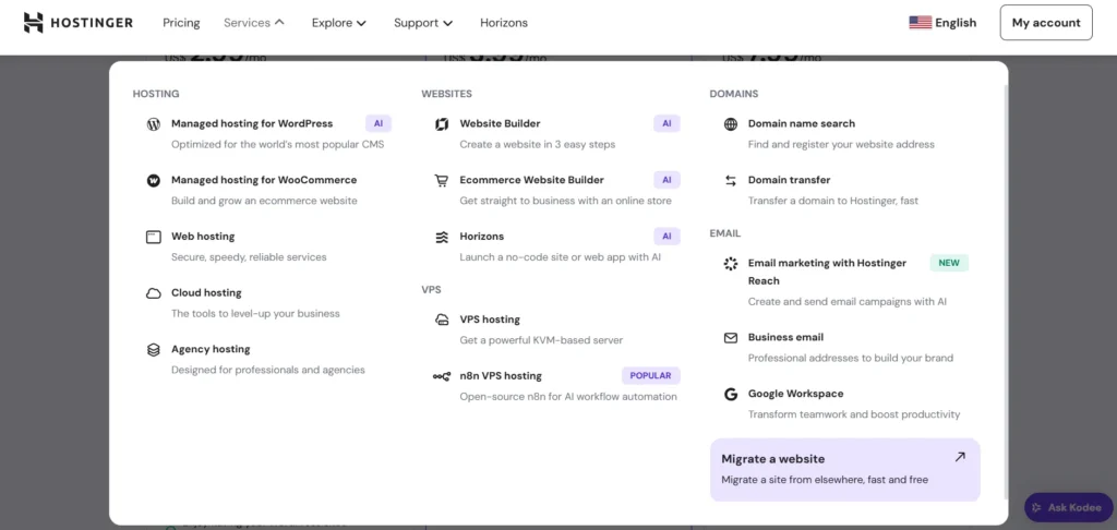 - AI Integration: Hostinger has integrated AI into its services. From website building to logo creation and email marketing, the tools make creating and managing a website easier than ever before.