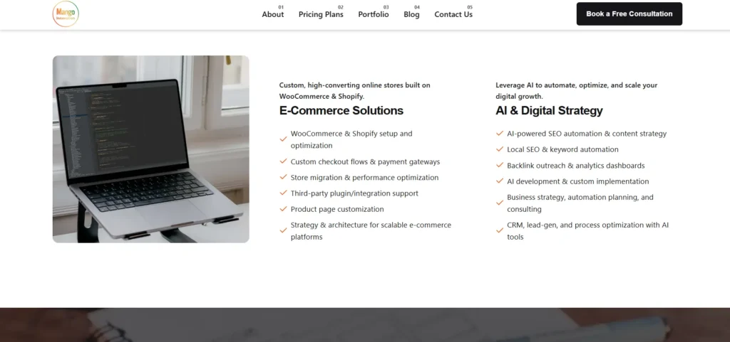 Beyond design, Mango Innovation also integrates AI-powered SEO automation into its services, optimizing clients’ websites for search engines through keyword strategy, content creation, and backlink outreach.